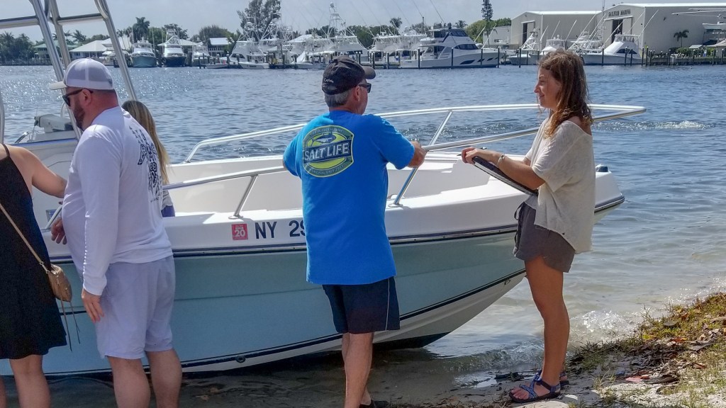 Right: Alexa Putillo conducting a social survey with a boater in the St. Lucie Inlet, Florida.