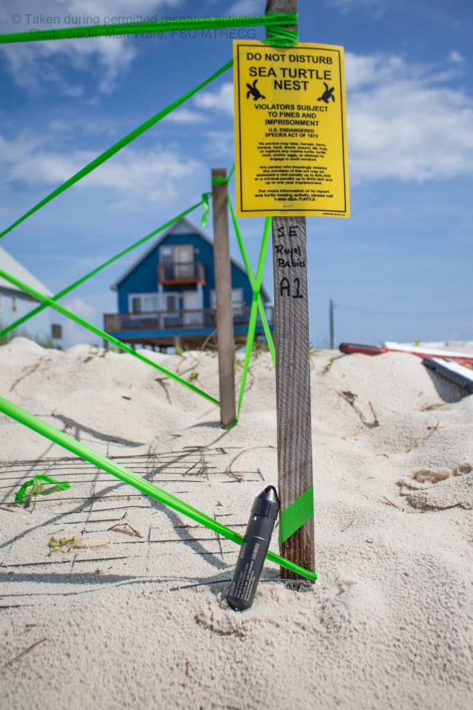 To help answer these questions, this project will take a look at the frequency, duration, severity, and timing of wave exposure and groundwater inundation events during the 2021 nesting season at a major nesting beach in the Florida Panhandle – Saint George Island. A collaboration between the island’s volunteer, citizen science sea turtle monitoring program (https://floridadep.gov/rcp/nerr-apalachicola/content/sea-turtle-monitoring-anerr, https://www.facebook.com/SGI.Volunteer.Turtlers/) and researchers and students from Florida State University, the team will monitor wave wash-over and groundwater inundation using a combination of nesting surveys and HOBO water level loggers to see how they affect nest productivity.